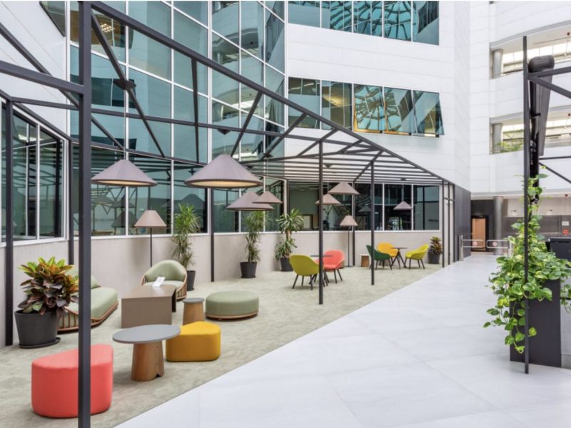 Está distribuido en dos alas independientes unidas por un atractivo vestíbulo central que proporciona mucha luminosidad a las zonas comunes y al interior de todo el edifico, gracias a su gran bóveda superior de cristal. En este luminoso hall central que une las 2 alas se encuentran los vestíbulos de ascensores y escaleras que comunican todas las plantas.
